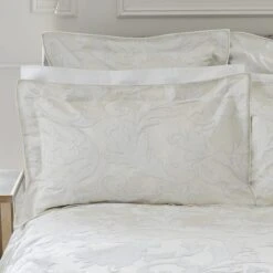 Resplendent large scale scrolls are woven into a decorative raised cream jacquard design on this opulent Dorma Acanthus oxford style pillowcase pair with piped edge styling. Finished with a concealed flap closure, these oxford pillowcases are machine washable and are crafted from a soft cotton blend for a sumptuously soft feel. Coordinating duvet cover and accessories available sold separately.