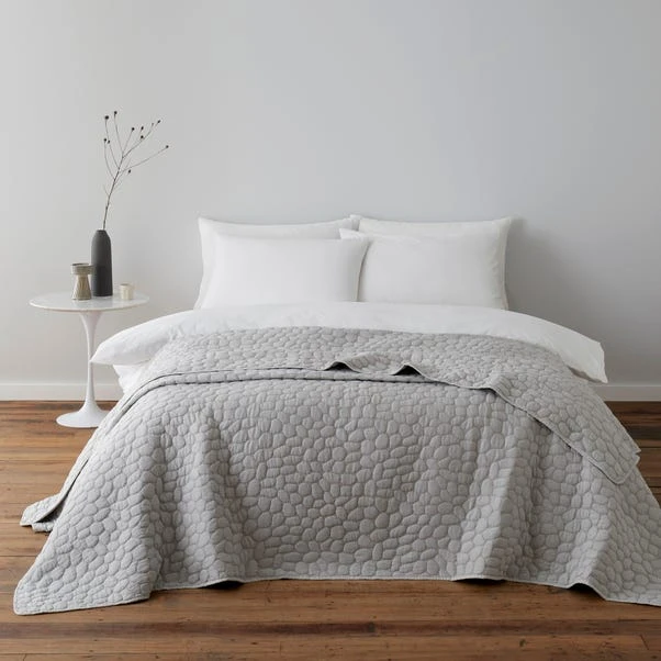 Patterned with pebbles, this grey bedspread is finished with piped edging and is available in a choice of sizes.