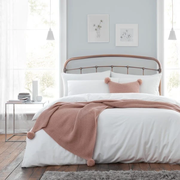 With a close knit texture and pom pom in each corner, this throw makes a great addition to the bedroom, and it’s soft handle means not only does it make a stylish touch but you can also snuggle up warm beneath it. We style it with a plain white duvet set and pom pom cushion.