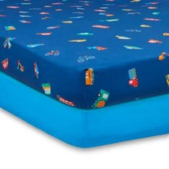 Cover your little one’s bed in style with these fitted sheets. One sheet feature a multi-directional transport themed pattern on a navy background. The second sheet is a plain blue colour. Each sheet is crafted from an easy to care for polycotton material which is fully machine washable.
