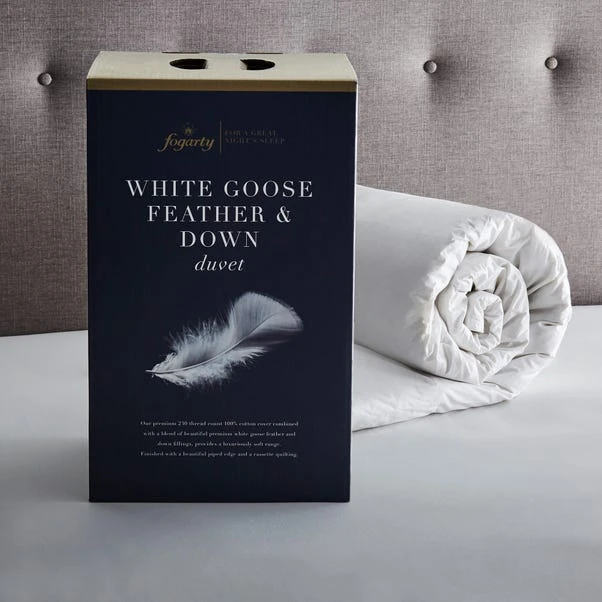 Achieve ultimate comfort while you sleep with this beautiful blended goose feather and down 13.5 tog duvet from the experts at Fogarty. Boasting a premium 230 thread count, durable piped edging and a sumptuously crisp cotton cover, this duvet has been designed with cassette quilting for even filling distribution. Machine washable and tumble dryer safe for added convenience, this duvet is available in a variety of sizes.